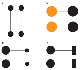 c,d: Die Verbindungslinien wirken stärker als die Gesetze von Ähnlichkeit und Nähe.