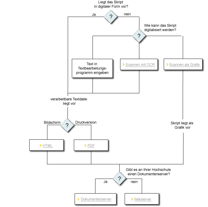 Welche Entscheidungen müssen Sie treffen und welche Vorgehensschritte sind notwendig, wenn Sie Ihr Skript ins Netz stellen wollen? Je nachdem, ob Ihr Skript bereits in digitalisierter Form vorliegt, oder nur als Papiervorlage, ob Sie sich für eine Aufbereitung als Hypertext entscheiden oder nur eine Druckversion ins Netz stellen wollen, unterscheiden sich die Vorgehensweisen.