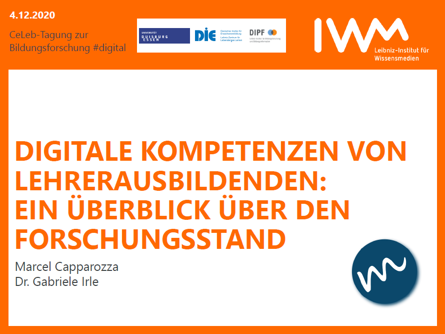 - Wissenschaftstransfer: In Kooperation mit dem Leibniz-Institut für Bildungsforschung und Bildungsinformation (DIPF) werden von den Verbundpartnern jährlich Critical Reviews erstellt, die den nationalen und internationalen Forschungsstand zu relevanten Aspekten der Bildung mit digitalen Medien thematisieren und für die Praxis aufbereiten. Am IWM wurden folgende Reviews zu Fragestellungen aus dem Bereich der Lehrerbildung mit digitalen Medien veröffentlicht: