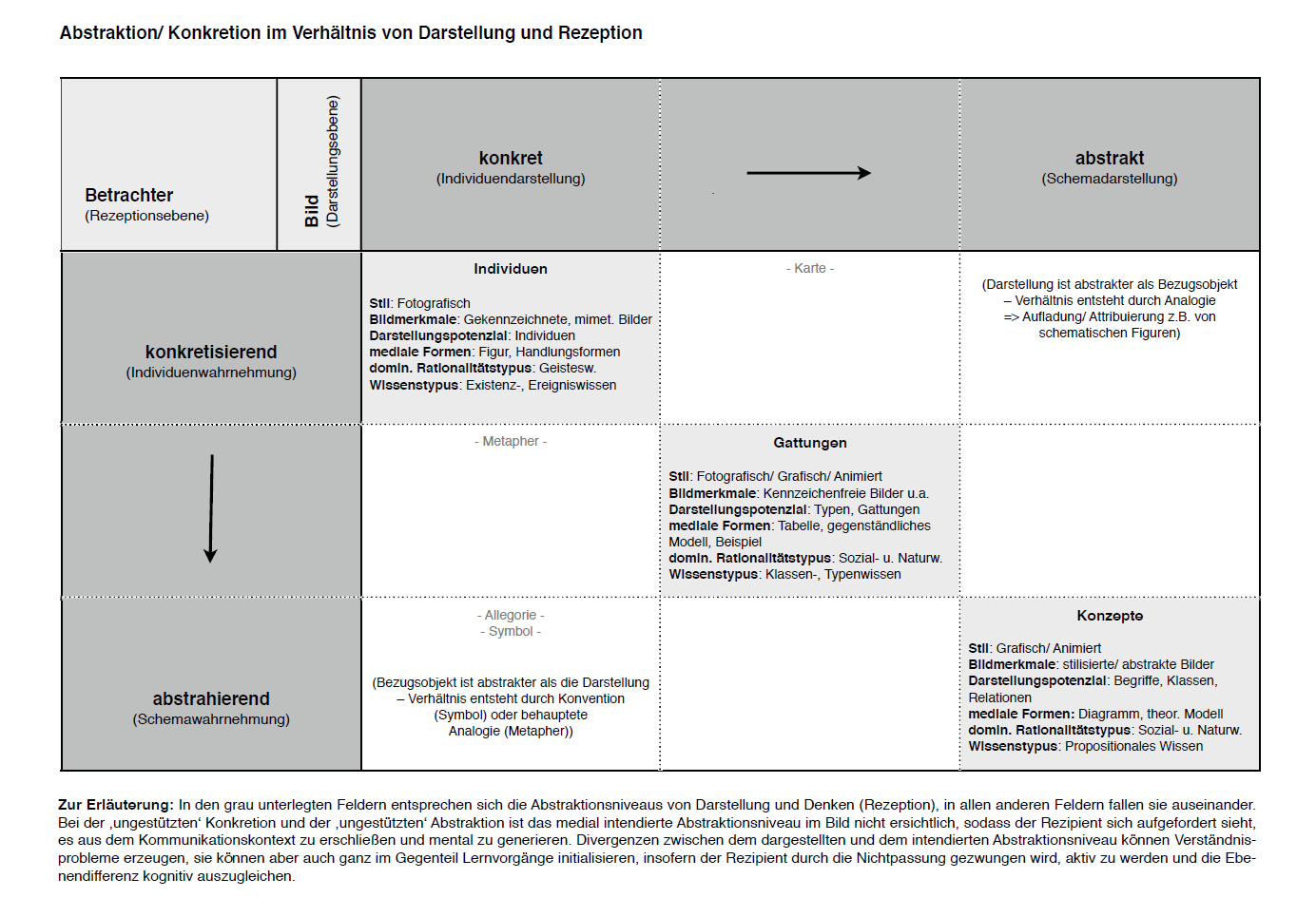 Hellermann: Nicht unbedingt. Er kann diese Kluft, wie schon angedeutet, eben durch die Verwendung begriffsfähiger Bilder überwinden, die erwähnten Allgemeinbilder der Konzeption und der Relation – oder aber die Lücke muss vom Rezipienten durch die kognitive Interaktion mit dem medialen Material selber ideell geschlossen werden. Es zeigt sich also, dass der Begriff der Abstraktion sich sowohl auf ein Darstellungsverfahren, als auch auf eine Operation des Denkens bezieht. Der Rezipient sieht sich im Wissenschaftsfilm entsprechend immer aufgefordert, das gemeinte Darstellungsschema und hier das gemeinte Abstraktionsniveau zu erkennen und gegebenenfalls selbst herzustellen, indem er etwa ein Bild als Beispiel oder als Typus versteht und damit die Darstellung eines individuellen Objektes als Element einer Klasse denkt. Ist das Abstraktionsniveau des verwendeten medialen Modus höher als das seiner eingesetzten (visuellen) Elemente, dann fordert die Inszenierung den Rezipienten demnach dazu auf, das konkrete Bild als Exempel eines allgemeinen Falls oder als Repräsentant eines Sachverhaltes zu behandeln und verlangt ihm damit eine geistige Abstraktionsleistung ab. Entspricht das Abstraktionsniveau der Bildebene dem der Sprachebene, so paraphrasiert die Bildebene die Ausführungen der Sprachebene, indem sie Anschauungen von Objektklassen oder Relationen präsentiert. Schließlich ist, wie es der Zeichentrickfilm zeigt, auch die umgekehrte Richtung möglich: Im Unterhaltungs-Trickfilm werden abstrakte Bilder häufig konkret interpretiert, eine schematische Darstellung demnach als individuelle Figur behandelt. In der Summe ergeben sich damit vier mögliche Pole, wie sich das Verhältnis von kognitiver und darstellerischer Abstraktion im Extremfall ausprägen kann.