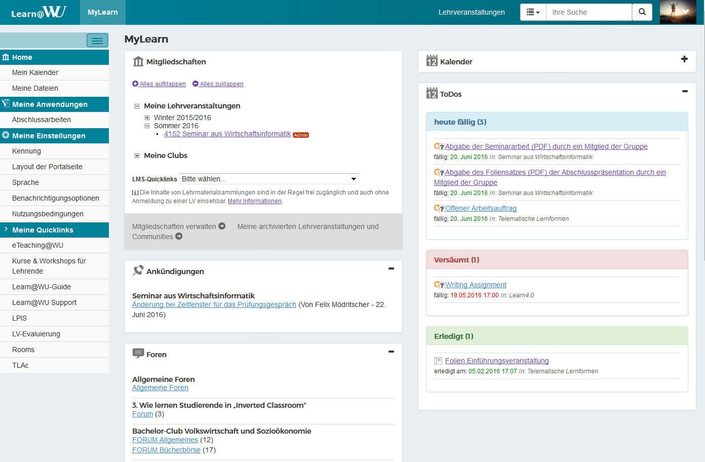 Die personalisierte Startseite von Learn@WU bietet einen Überblick über anstehende Lernaktivitäten. vergrößern