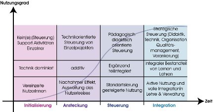 Nach einer Modellvorstellung entspricht die Implementierung von E-Learning einer S-förmigen organisationalen Lernkurve. Die meisten Hochschulen befinden sich etwa im Mittelfeld, das heißt, sie haben bereits die technische Infrastruktur ausgebaut allerdings den mediendidaktisch sinnvollen Einsatz der Technik noch kaum realisiert.