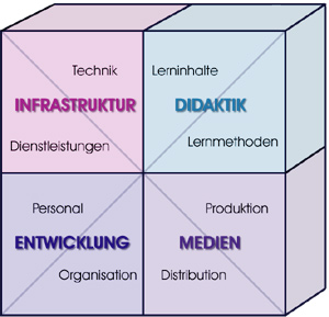 Kerres (2001) identifiziert vier Aktionsfelder, die für eine systematische Integration von Medienaktivitäten in einer Bildungsorganisation erforderlich sind und die im Portal näher beschrieben werden:
