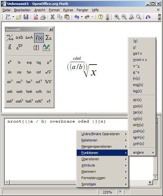 "OpenOffice Math", ein Bestandteil des kostenlosen OpenOffice-Pakets, bietet komfortable Optionen, um Formeln per Drag & Drop zusammenzufügen oder über eine spezielle Beschreibungssprache direkt einzugeben. Hierbei handelt es sich um ein separates Programm, aus dem die Formeln übernommen werden können. Der Bildschirm ist dabei zweigeteilt: Neben dem Eingabefenster in der unteren Hälfte wird auch gleich das Ergebnis im oberen Bereich angezeigt.