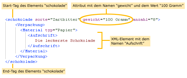 Alle XML-basierten Markup-Sprachen haben bestimmte Eigenschaften gemeinsam, die sie von XML übernehmen. XML-Dokumente bestehen aus Text, der durch Elemente und Attribute strukturiert wird. Elemente werden wie in HTML mit spitzen Klammern (Tags) ein- und ausgeleitet. Ein Element besteht entweder aus einem Start- und einem End-Element oder kann in einer Kurzschreibweise notiert werden. Die Namen der Elemente können innerhalb bestimmter Konventionen für jede Markup-Sprache frei gewählt werden. Innerhalb eines Elementes darf entweder Text oder ein weiteres Element bzw. eine Mischung aus Beidem stehen. Überdies kann jedes Element mit einem oder mehreren Attributen versehen werden. Attribute bestehen jeweils aus dem Attribut-Namen und einem Attribut-Wert.