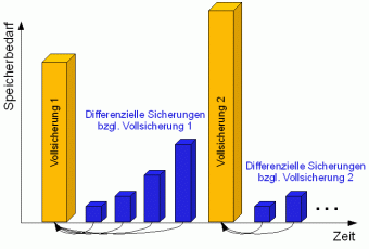 Abbildung 1: Beim differenziellen Backup werden stets alle Veränderungen seit der letzten Volldatensicherung erfasst. |