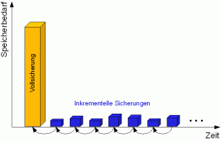 Grundsätzlich unterscheidet man zwischen zwei Arten der Datensicherung. Zum einen können alle Daten, die sich auf der Festplatte oder auf einem Netzlaufwerk befinden, komplett abgespeichert werden (vollständige Datensicherung oder Volldatensicherung). Zum anderen können nur die Daten gesichert werden, die sich seit der letzten Datensicherung geändert haben. Beziehen sich nachfolgende Backups immer auf die letzte Volldatensicherung, so nennt man dies differentielle Datensicherung und es werden jedes Mal sämtliche Veränderungen seit der letzten Volldatensicherung erfasst. Bei der inkrementellen Datensicherung werden immer nur diejenigen Daten gesichert, die sich seit dem Zeitpunkt der letzten Sicherung (Volldatensicherung oder letztes Inkrement) verändert haben.